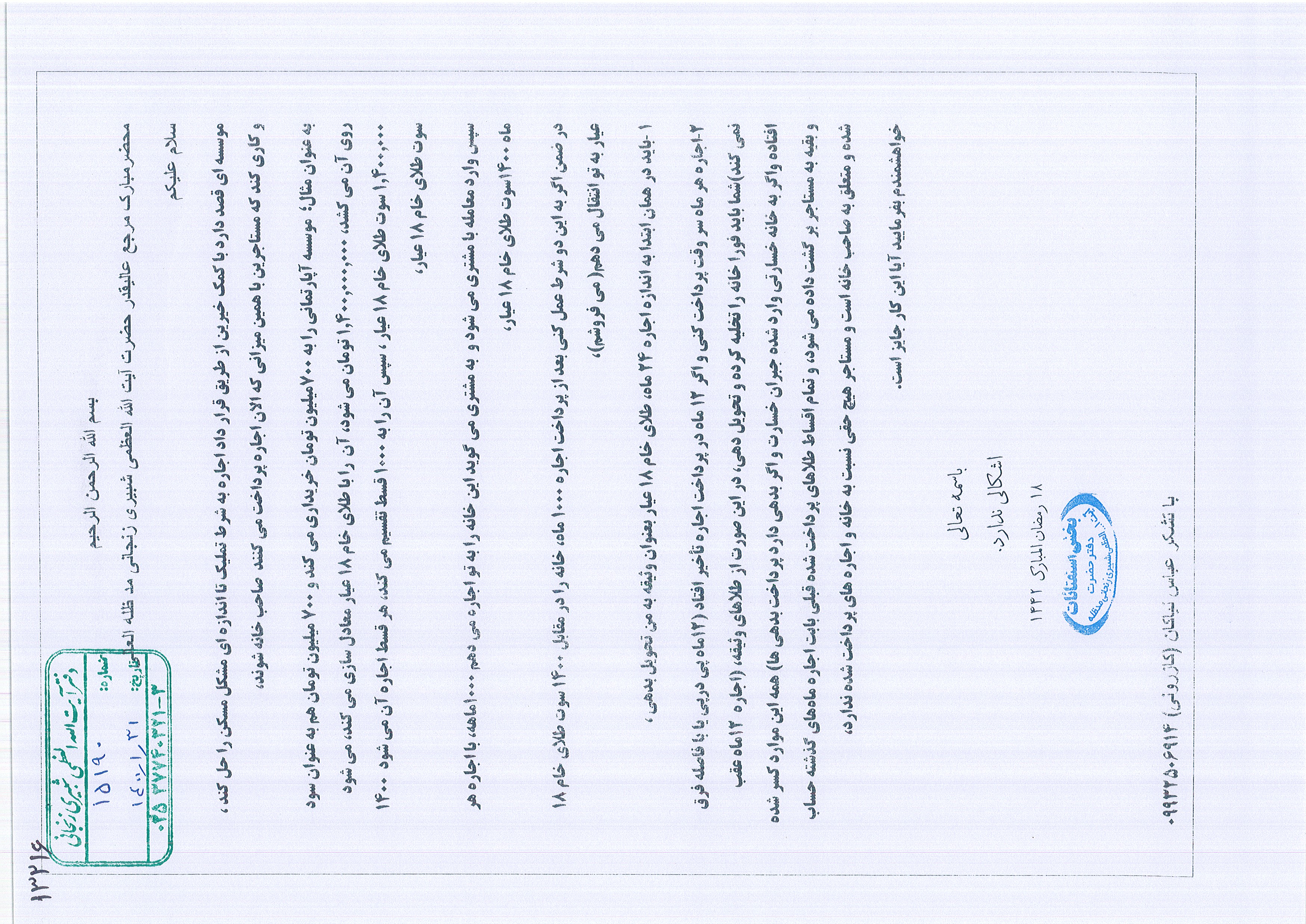 در ضمن اگر به این دو شرط عمل کنی بعد از پرداخت اجاره 1000 ماه، خانه را در مقابل ۱۴۰۰ سوت طلای خام ۱۸ عیار به تو انتقال می دهم( می فروشم)،